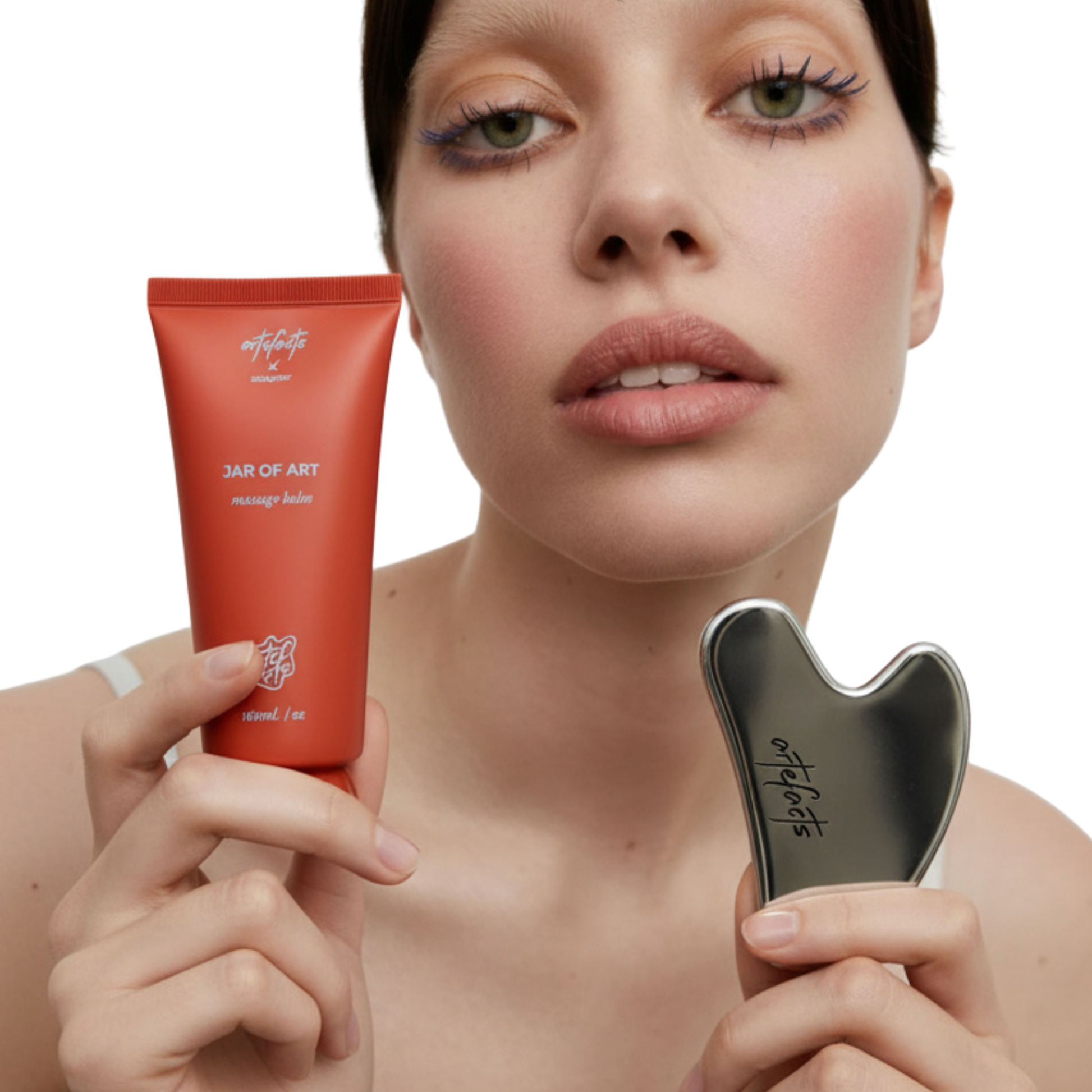Нанесіть Jar of Art для самомасажу на чисту, суху шкіру й виконайте самомасаж обличчя руками або гуаша. Масаж активує мікроциркуляцію, зменшує ранкову набряклість і підвищує сприйнятливість шкіри до доглядових компонентів.